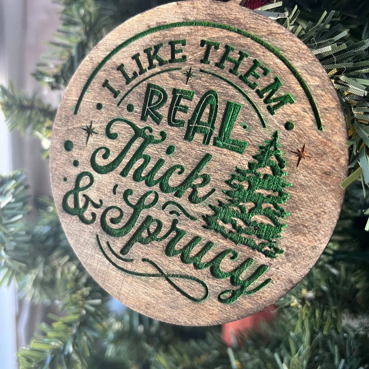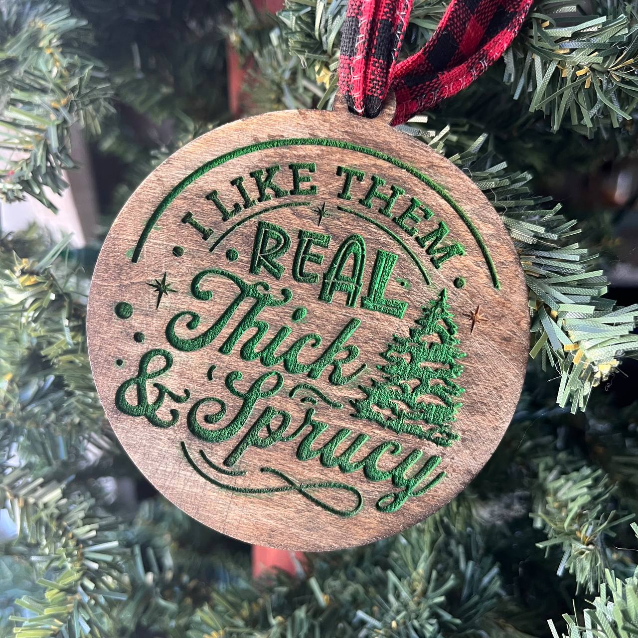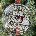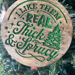 Funny Christmas Tree Ornament – “I Like Them Real Thick & Sprucy” – 3.25” Round Rustic Wood Holiday Decor – Hilarious Gag Gift for Tree Lovers