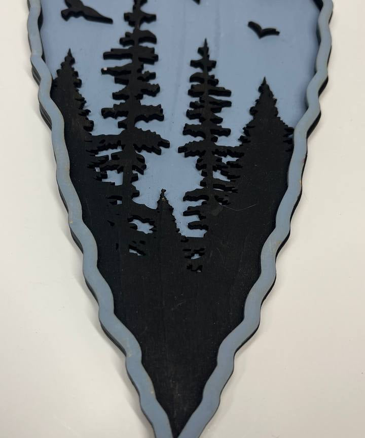 Hand-Painted 2-Layered Arrowhead with Forest & Flying Birds – Rustic Nature Wall Art