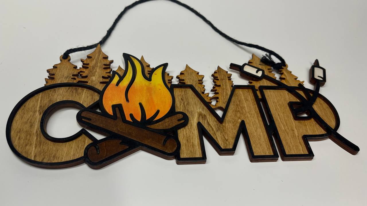 Hand-Painted Wooden "CAMP" Sign – Rustic Campfire & Marshmallow Decor