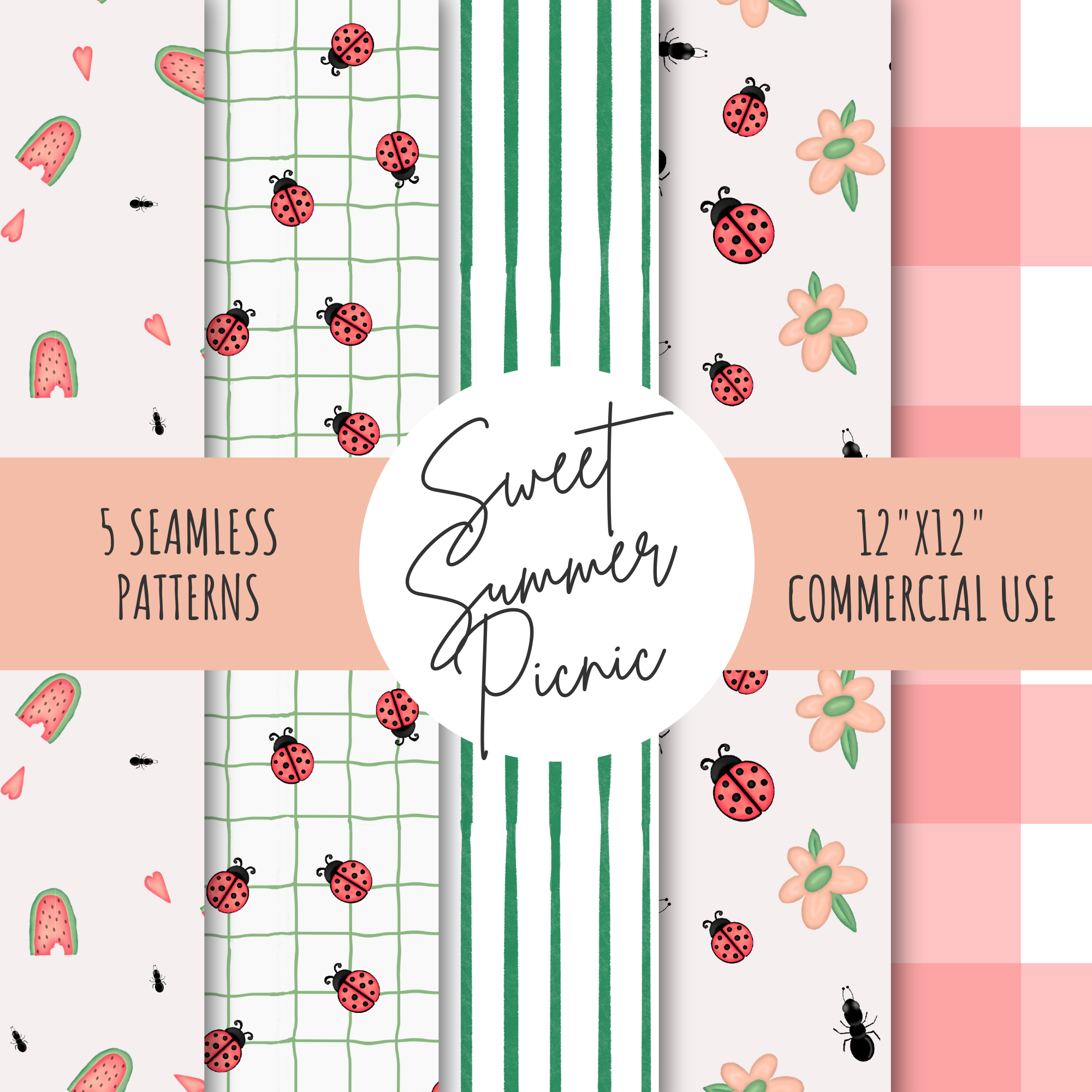 Sweet Summer Picnic Seamless Pattern Collection | Watercolor Gingham, Stripes, Ladybugs, Ants & Watermelon Digital Designs for Fabric & Wallpaper