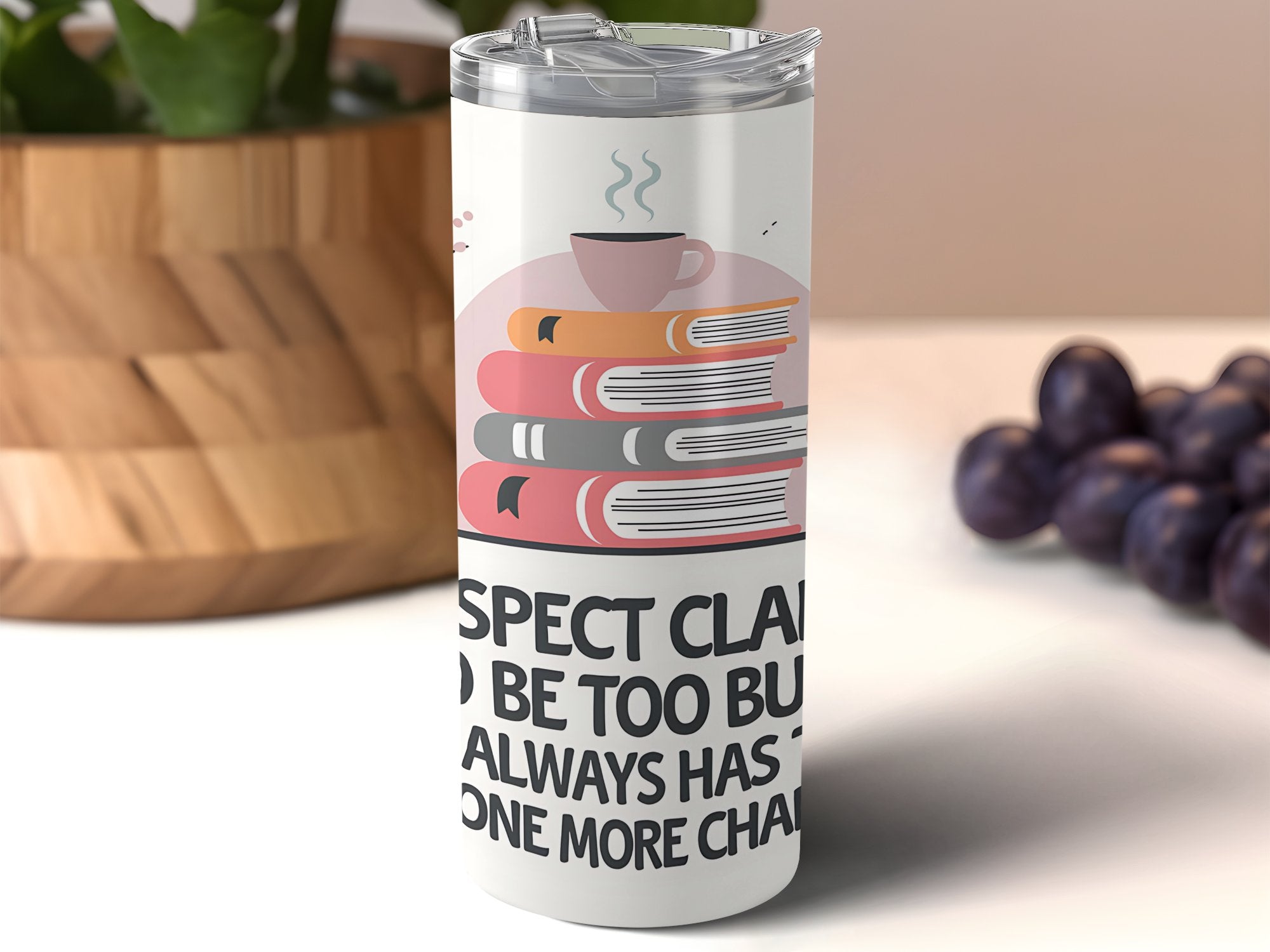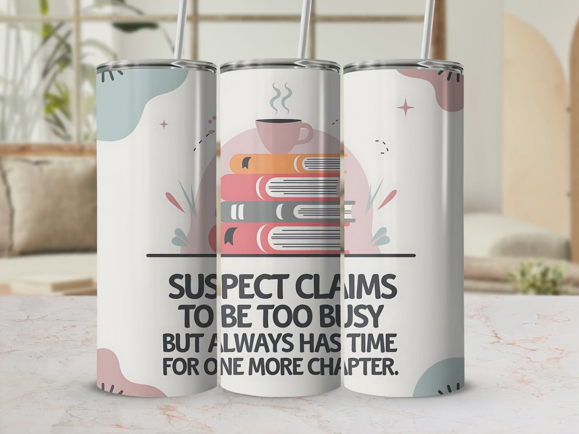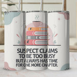 Suspect Claims to Be Too Busy but Always Has Time for One More Chapter | 20oz Skinny Tumbler Wrap PNG | Book Lover Sublimation Design