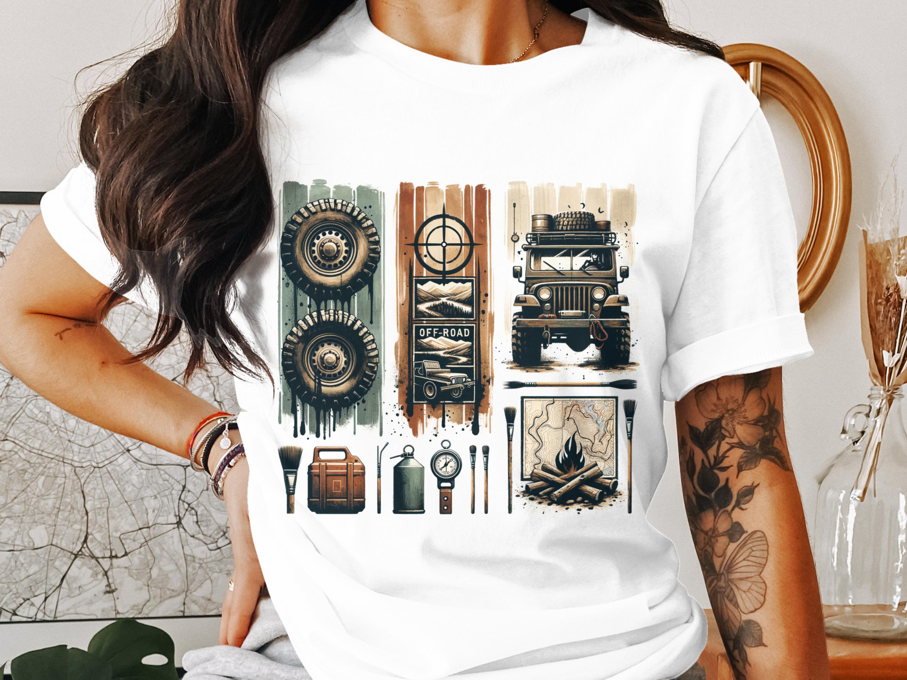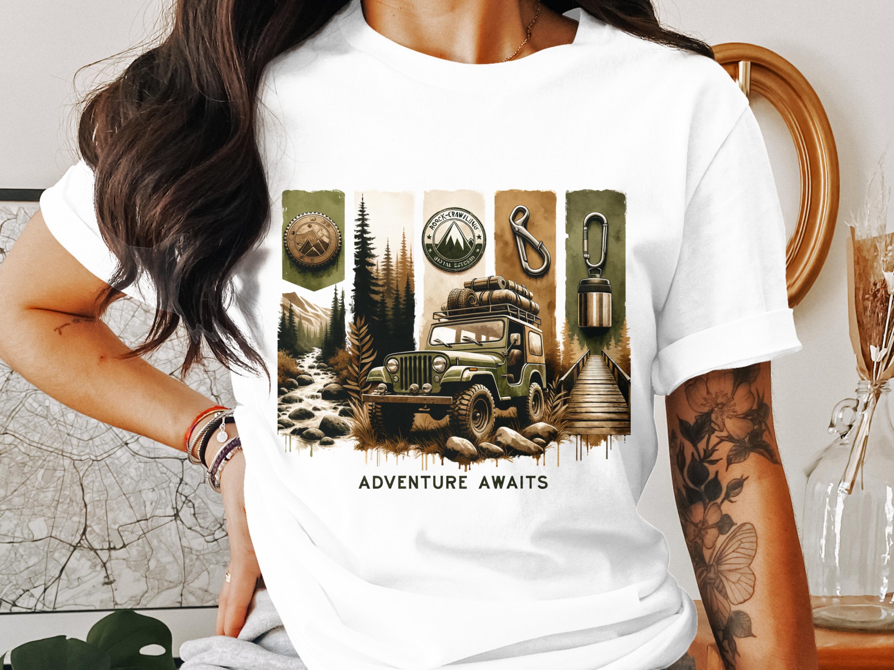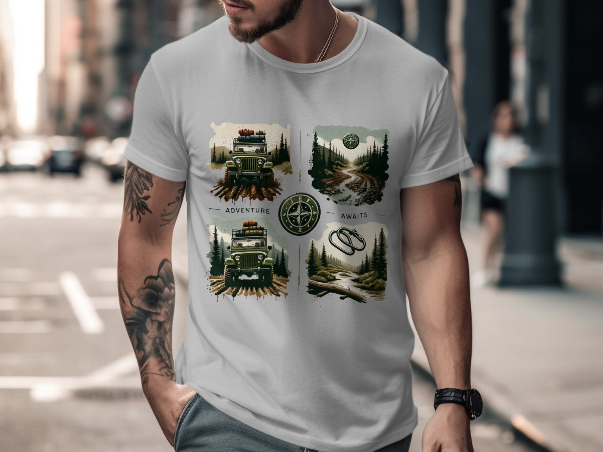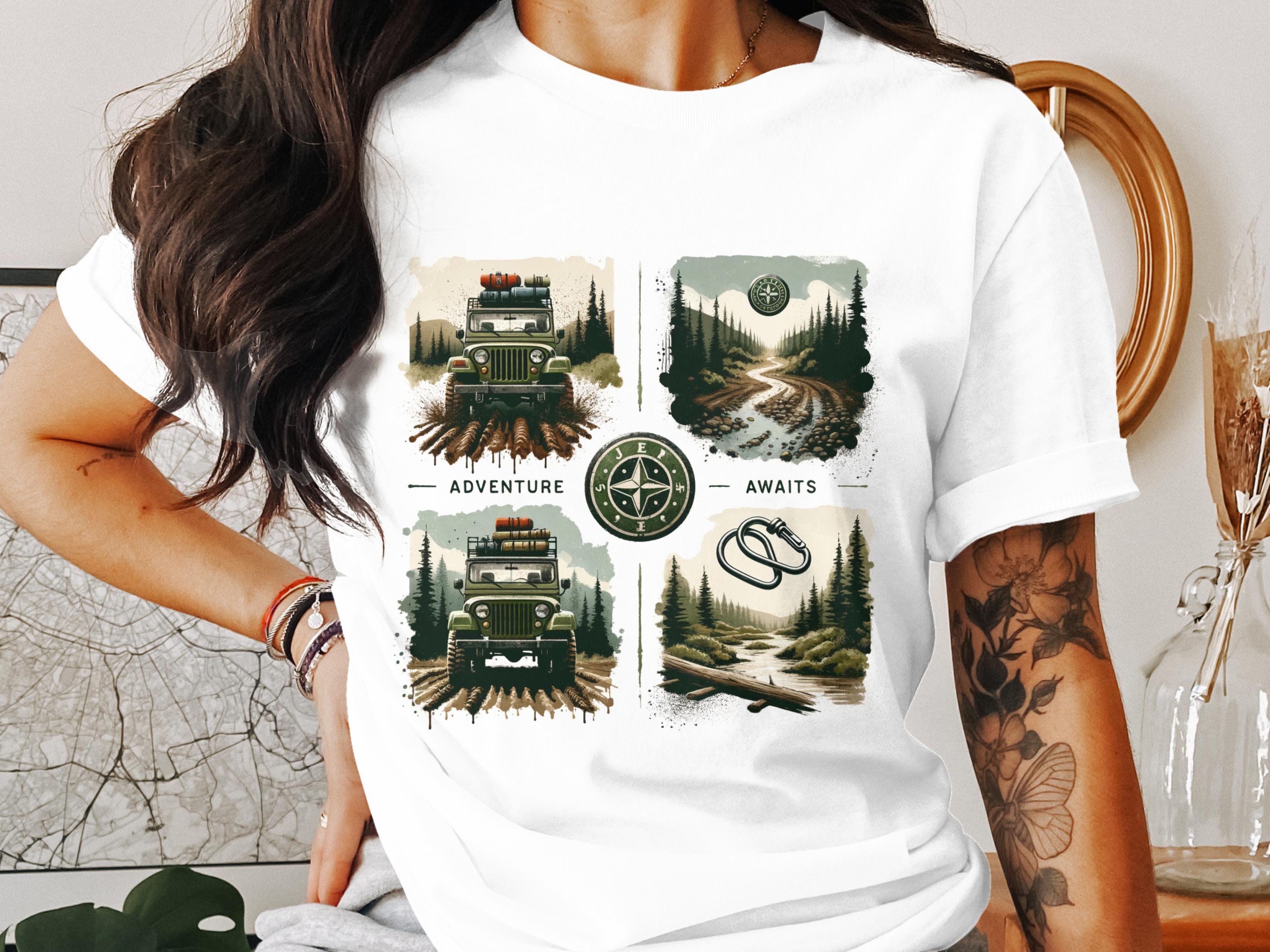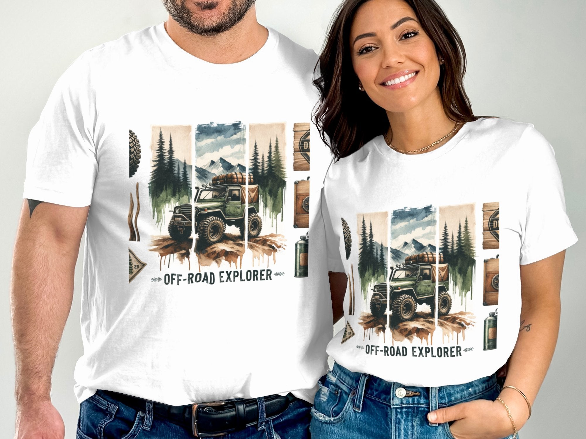 Vintage Jeep Mountain Landscape Graphic T-Shirt, Retro Outdoor Adventure Tee, Unisex White Cotton Shirt