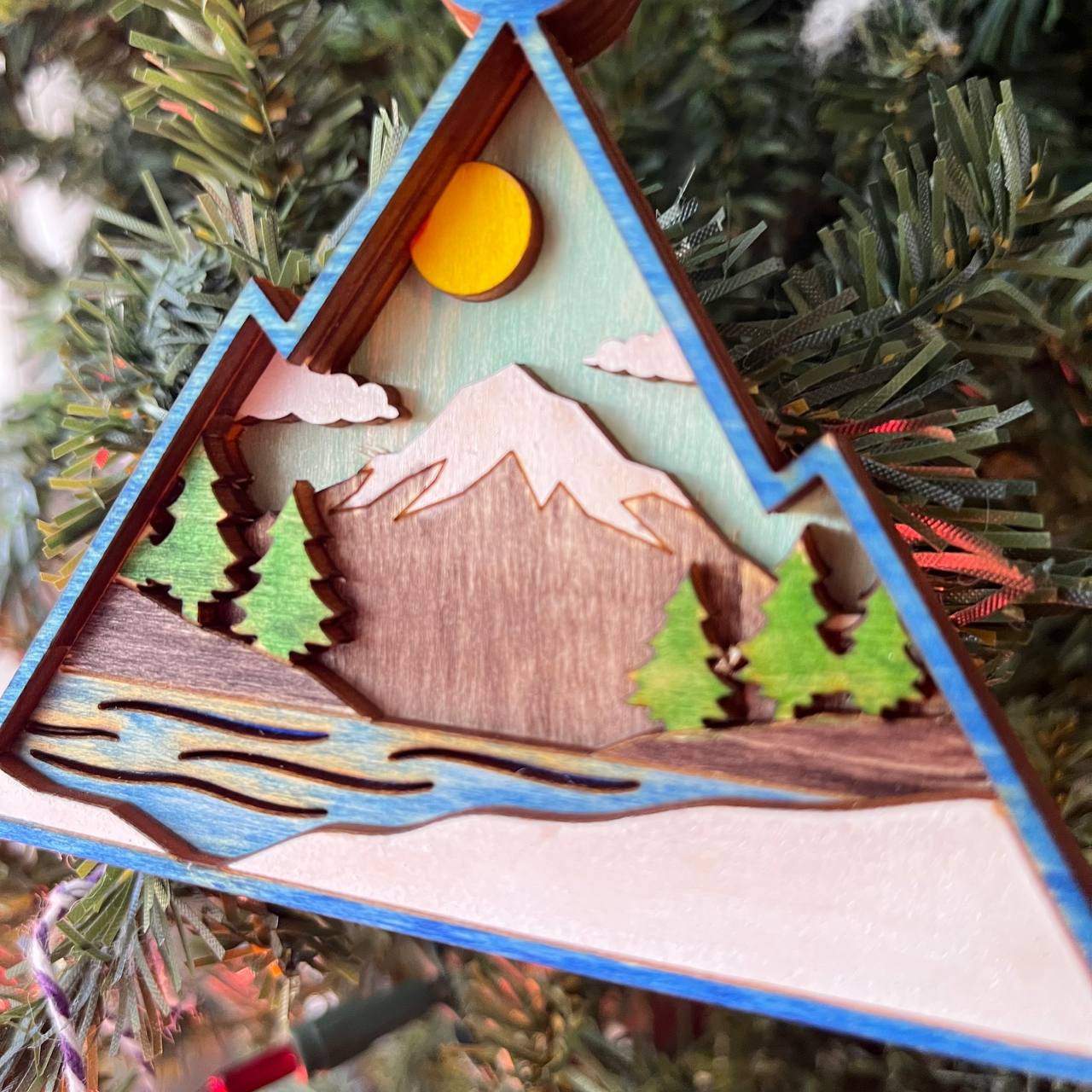 Rustic Mountain Christmas Ornament - Hand-Painted 4-Layer Wooden Nature Scene